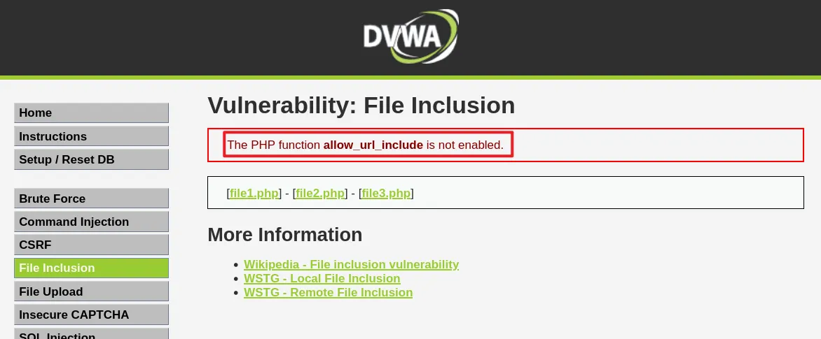 실습 환경의 경우 리눅스 환경에서 DVWA 환경을 구축한 후 가장 취약한 환경인 Low 레벨 환경에서 실습을 진행하였습니다. 또한 해당 실습을 위해서는 세팅에서 allow_url_include enable 설정이 필요합니다.