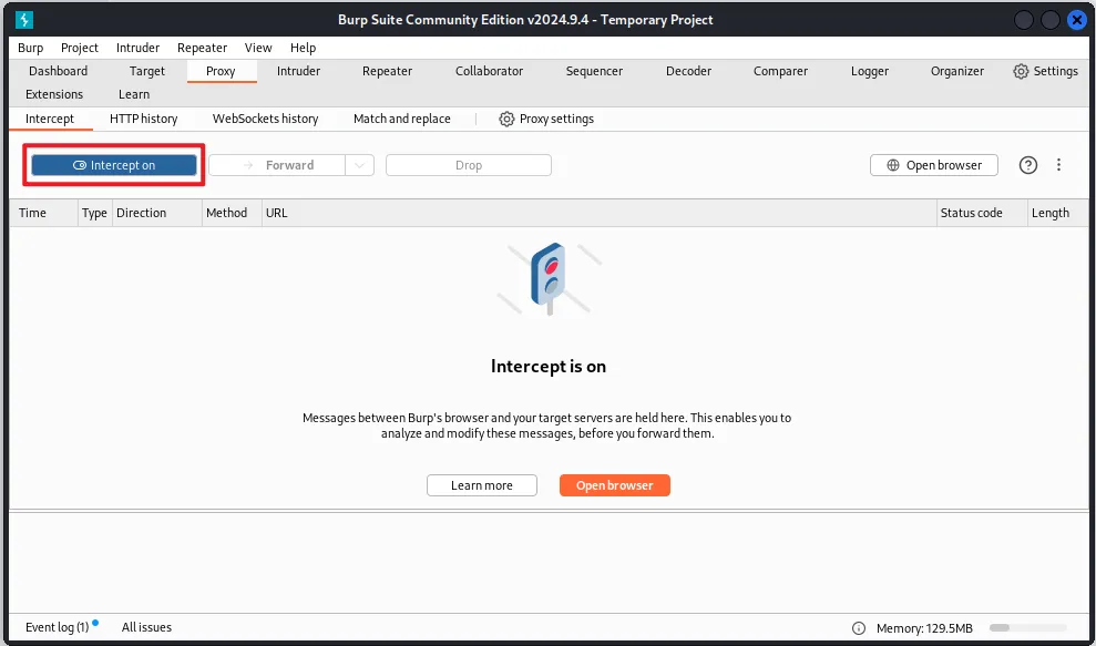 버프스위트를 통해 패스워드 변경 버튼을 클릭할때, 어떤 패킷을 주고받는지 확인해 보기 위해 Intercept를 켜줍니다.
