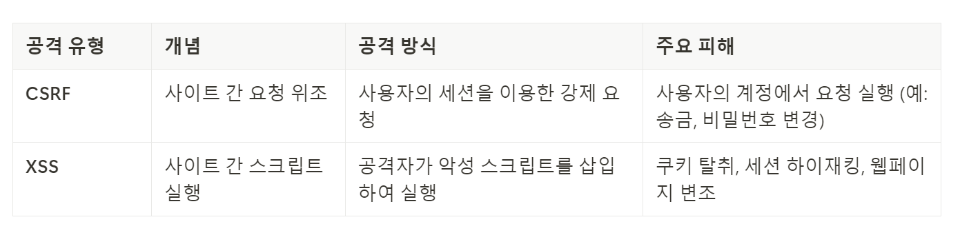 즉, CSRF는 사용자의 권한을 악용하여 요청(Request)을 조작(Forgery)하는 것이고, XSS는 악성 스크립트(Script)를 실행하여 민감한 정보를 훔치는 것에 중점을 둡니다.