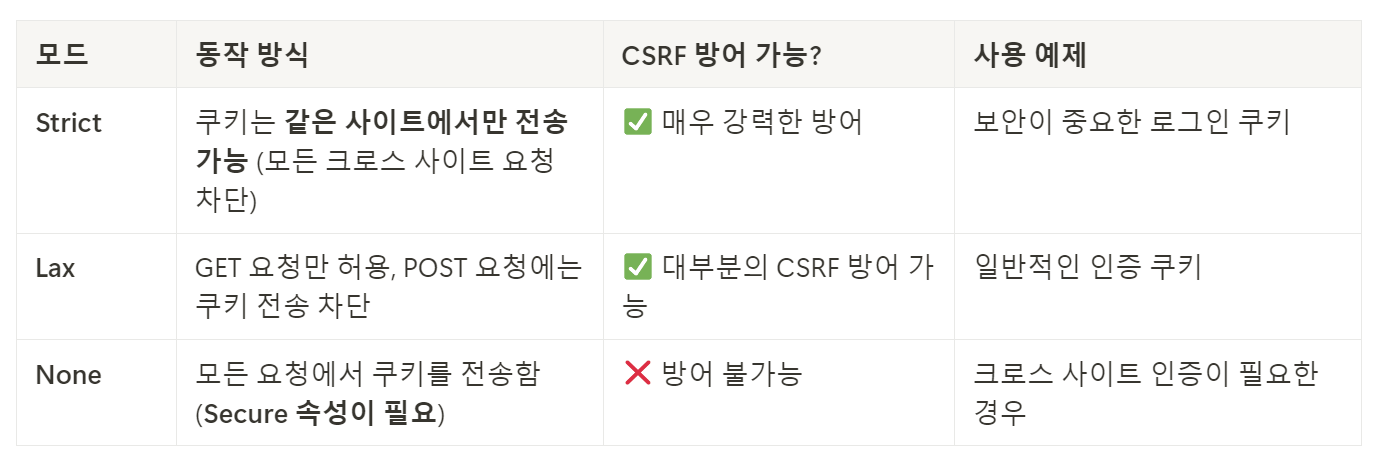 - Strict, Lax 모드를 사용 시, CSRF에 방어 가능