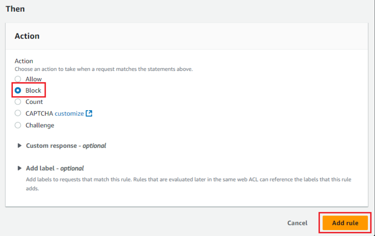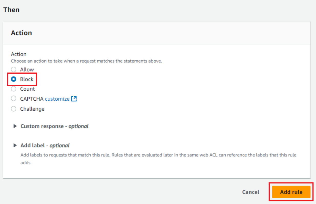 조건이 일치하면 어떤 행동을 취할지 작성하는 부분으로 차단(Block)을 선택 후, Add rule을 클릭합니다.