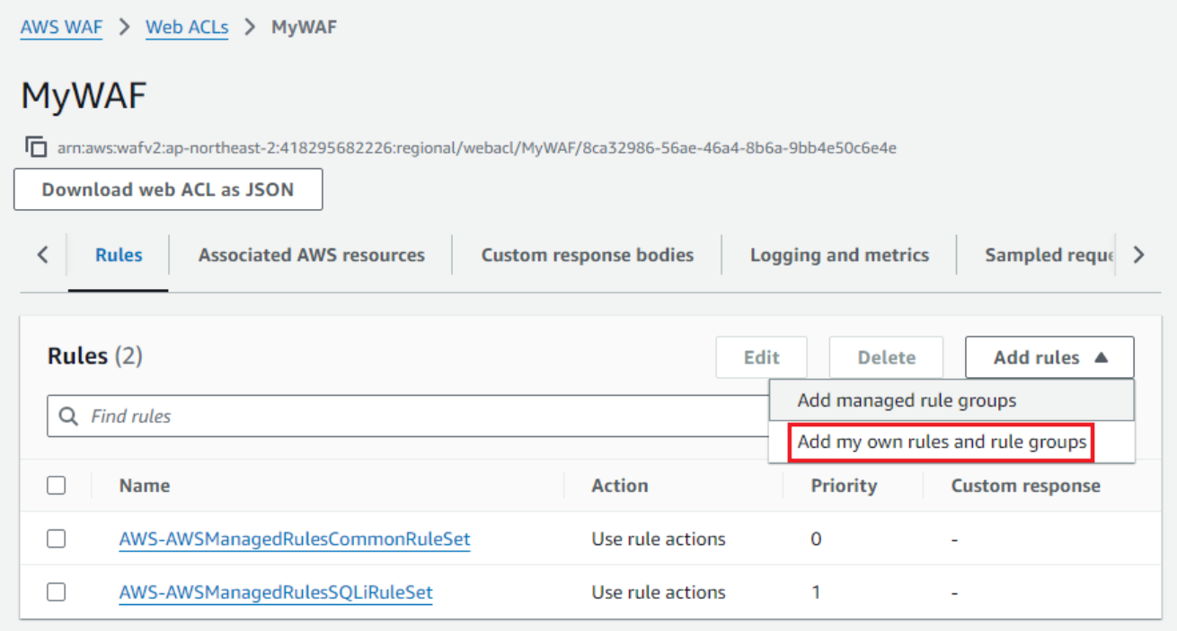 JSON 기반 Rule 설정을 하기 위해 Add my own rules and rule groups를 클릭합니다.