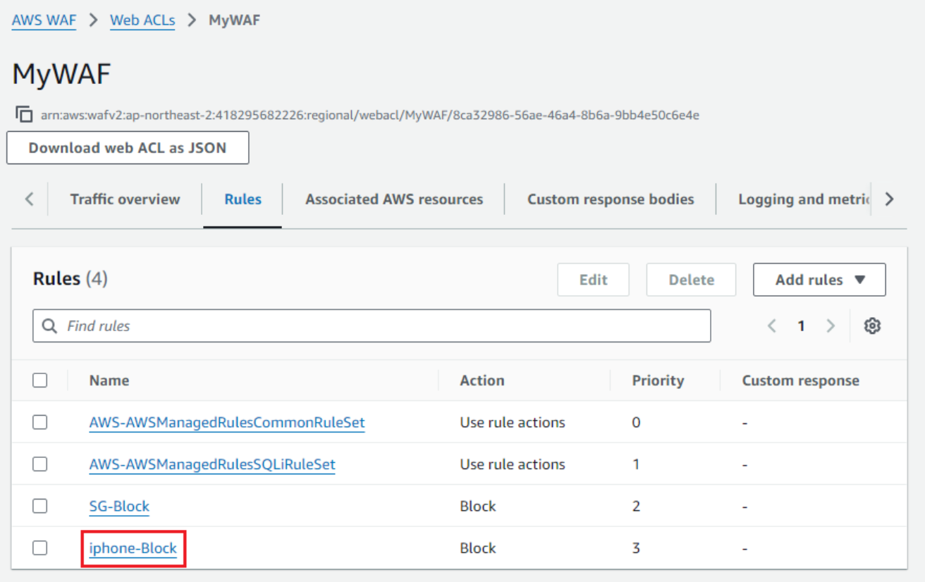 Custom Rule 적용 실습 두 번째로, AWS WAF에서 제공하는 문자열 일치 기반으로 특정 user-agent로 유입되는 트래픽을 차단하는 실습을 진행하도록 하겠습니다.