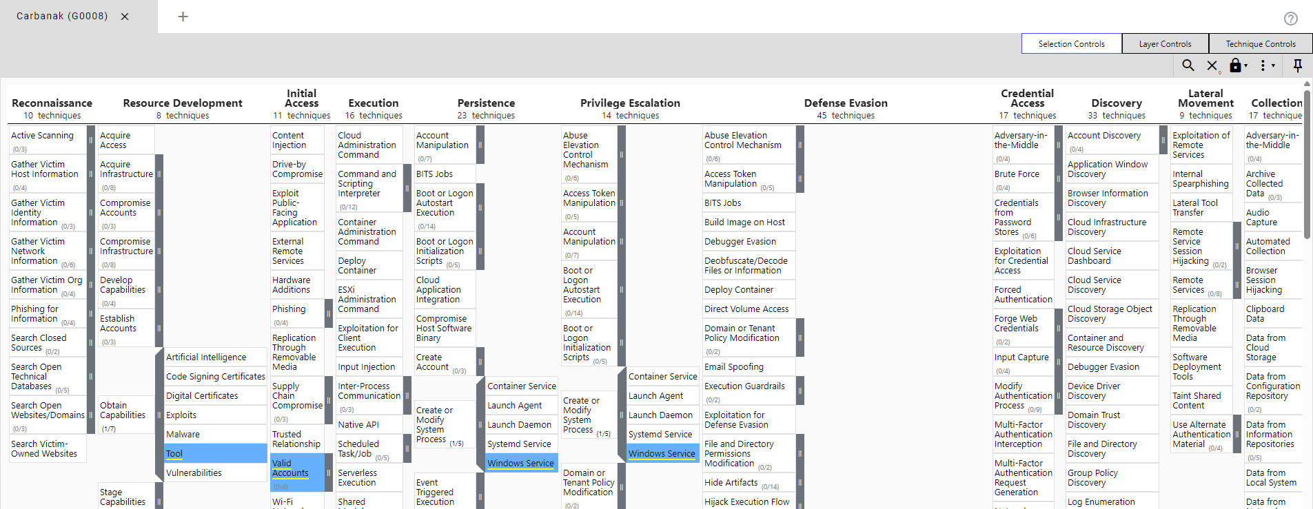 복잡한 ATT&CK 매트릭스를 효율적으로 활용할 수 있게 해주는 강력한 보조 도구로 특정 공격 그룹이 사용하는 기술을 색상으로 표시하여 확인이 가능합니다. (오른쪽 상단에 메뉴를 통해 설정이 가능합니다.)