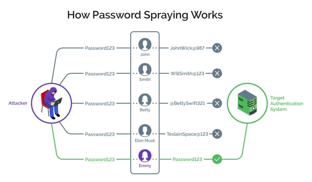 - 다수의 유저 계정을 상대로 하나의 비밀번호를 대입해 공격하는 방식