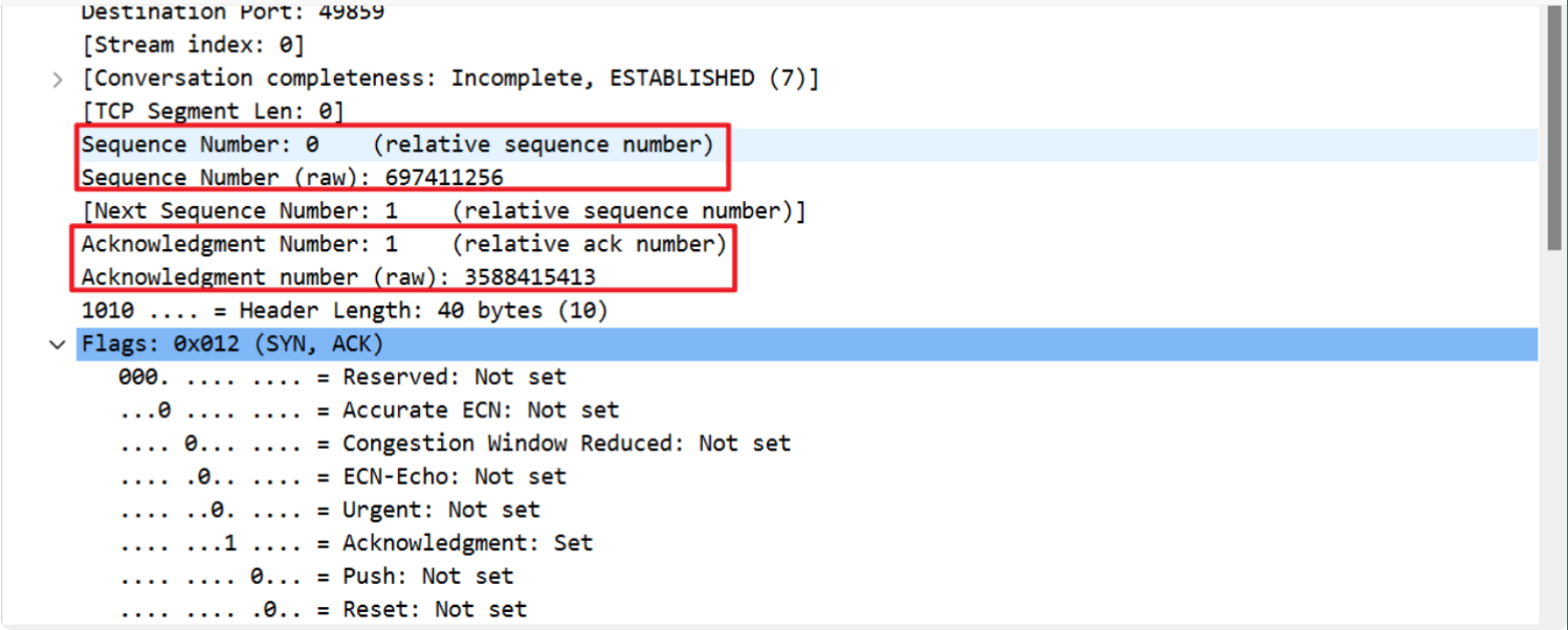 실제 순서 번호는 3588415413로 설정되어있으며, SYN+ACK 패킷에서 697411256를 받았으므로, 확인응답 번호는 다음으로 받기를 기대하는 순서인 697411257( 697411256 + 1)