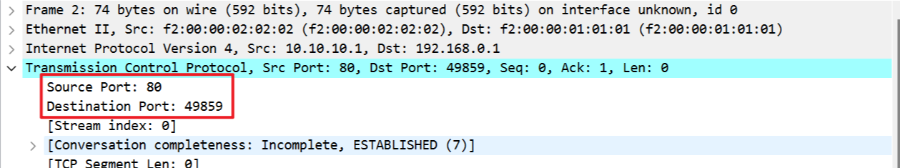 출발지 포트는 49859에서 도착지 포트는 80번 포트로 패킷 전송(클라이언트는 동적 포트 번호 중에서 임의의 포트 번호로 할당됨)