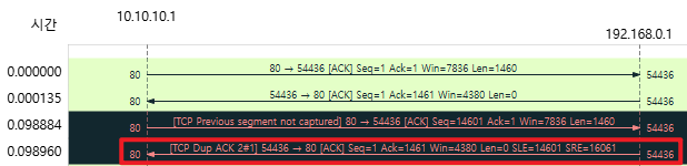 이를통해, 빠른재전송 방식으로 54436포트가 요청했던 Ack=1461 패킷을 전송한것을 확인할수 있다.
