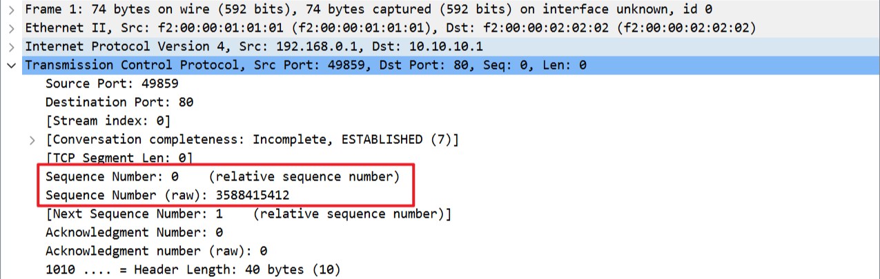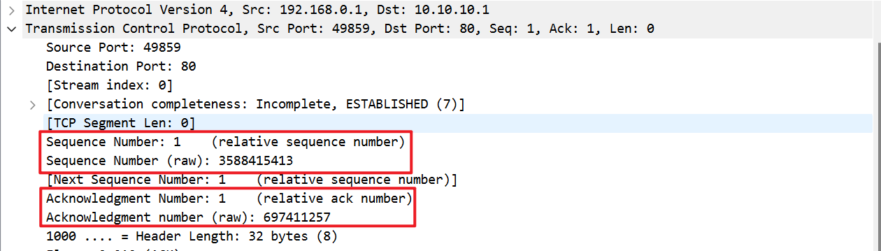실제 순서 번호는 3588415412로 설정되어있는것을 확인(와이어 샤크에는 보기 편하도록 상대적인 순서 번호를 제공한다.)
