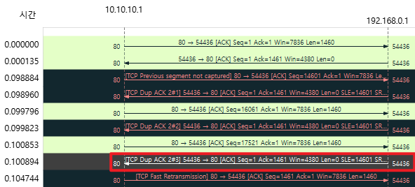 54436포트는 Ack=1461을 요청하는 패킷을 다시한번 재전송한다. 그림에서 [TCP Dup ACK2#2]를 통해 해당 패킷을 두번째 중복된 ACK 요청이라는것으로 확인할수 있다.