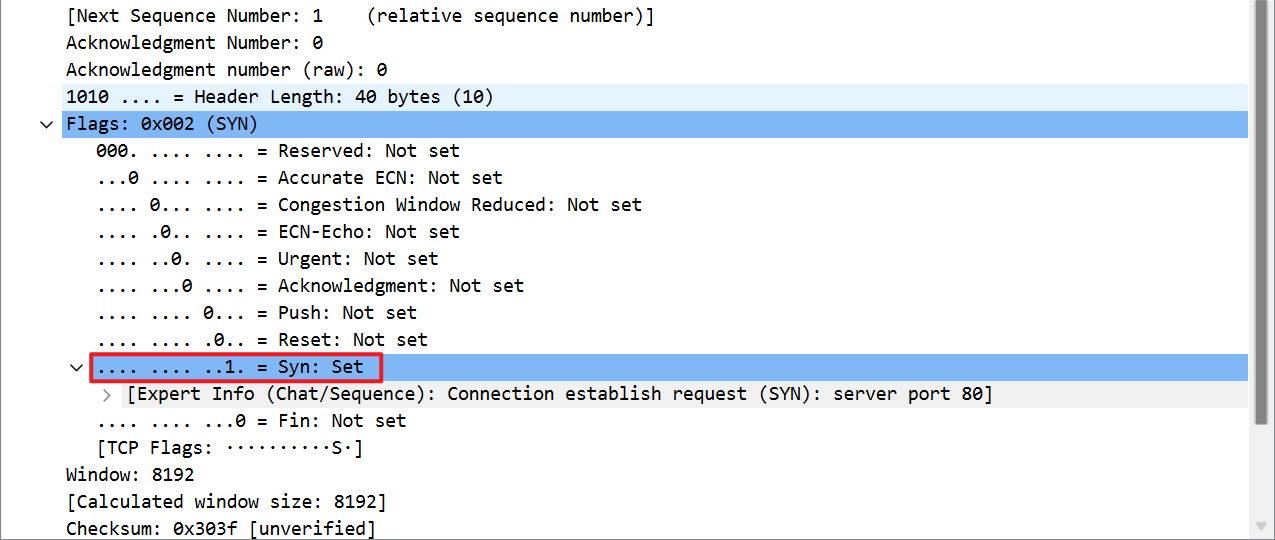 SYN 플래그 비트도 1으로 설정되있는것을 확인