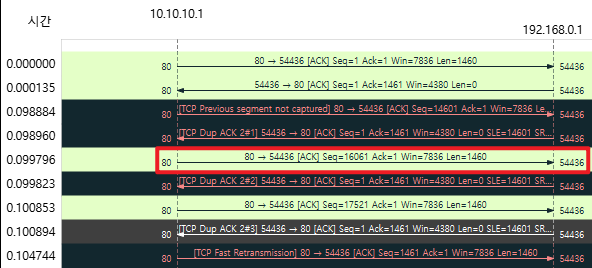 또한 [TCP Fast Restranmission]을 통해 빠른 재전송이 수행되었다는것도 확인할수 있다.