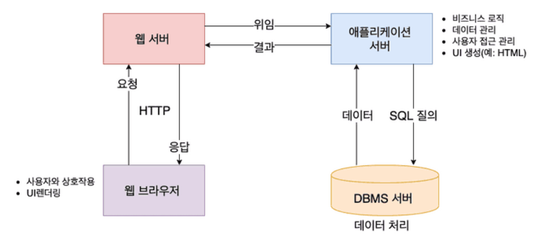 웹 애플리케이션 서버는 웹서버와 동일하게 HTTP 통신을 하며, 정적인 콘텐츠를 제공한다. 하지만 추가적으로 동적인 콘텐츠를 제공할수 있다는 측면에서 차이점이 있다. 예를 들어 사용자의 접근관리나 DB에서 데이터를 조회하는 것은 웹서버는 불가능하고, WAS가 가능하다.