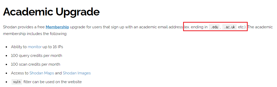 Academic Upgrade Shodan provides a free Membership upgrade for users that sign up with an academic email address (ex. ending in .edu, .ac.uk etc.). The academic membership includes the following: Ability to monitor up to 16 IPs 100 query credits per month