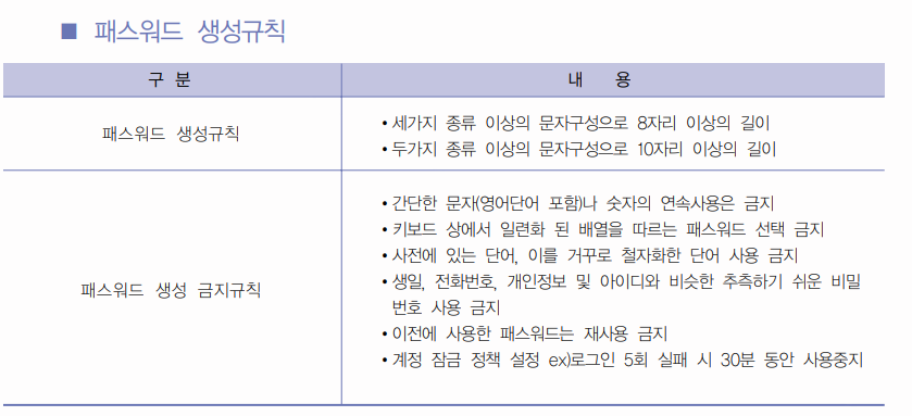 예를 들어 3가지 종류 이상의 문자구성과 8자리 이상의 길이의 패스워드를 생성하도록 하거나, 90일 주기로 패스워드를 변경하도록 권장하는 방법들이 존재한다.