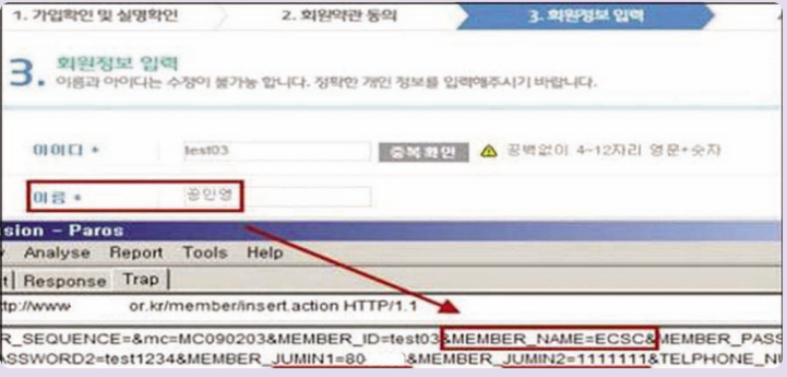 웹 프록시(proxy) 프로그램을 이용하여 이름을 ECSC로 수정하여 변조된 이름으로 회원가입을 시도한다.