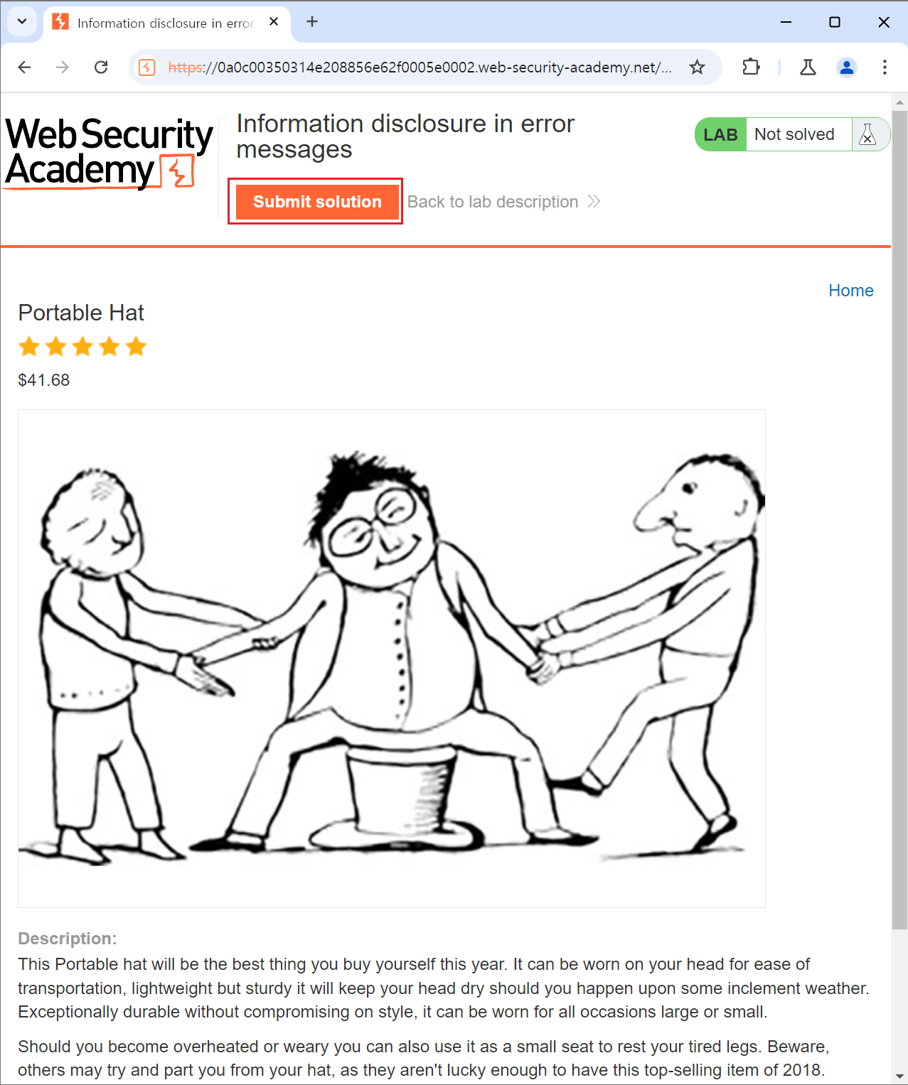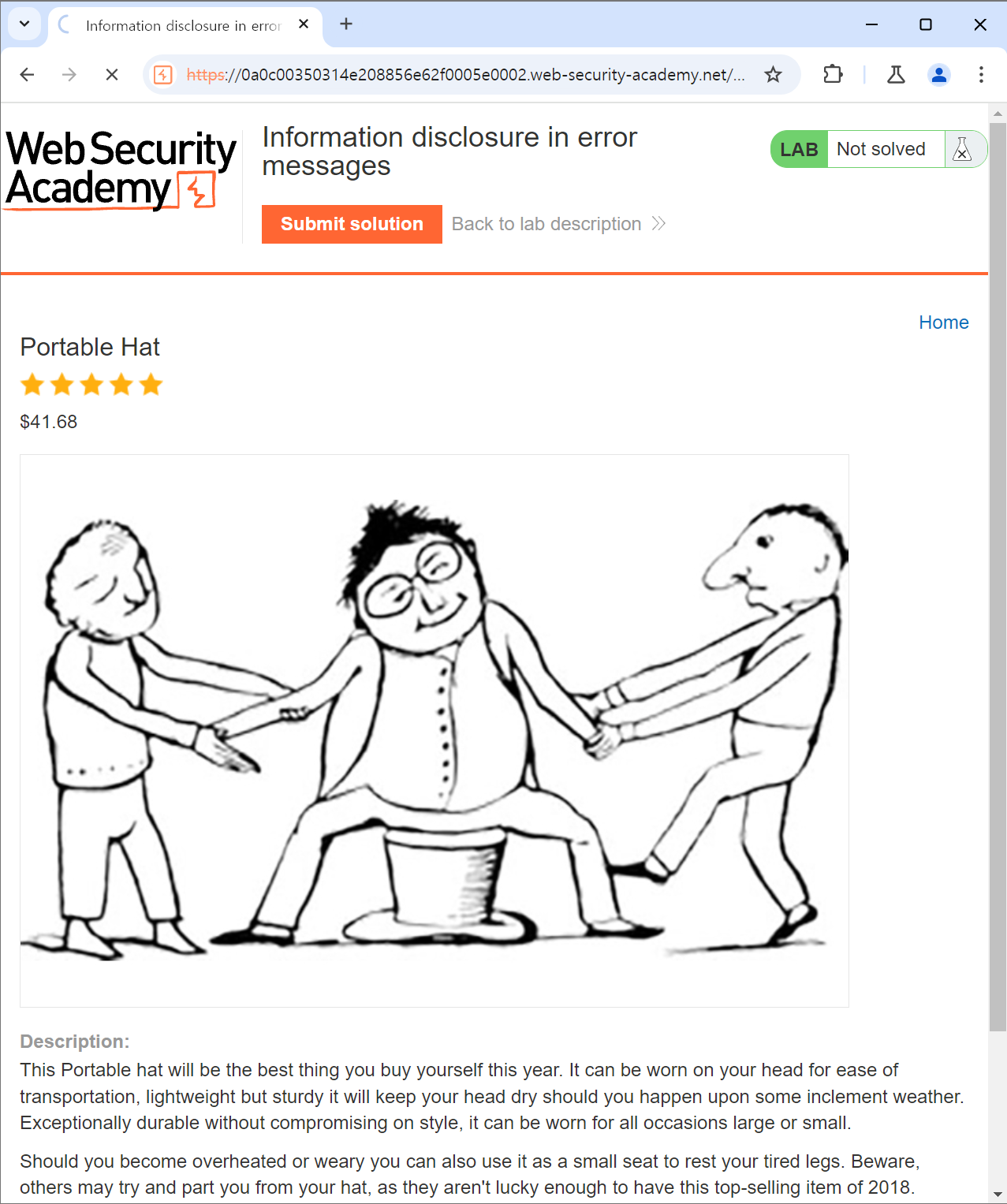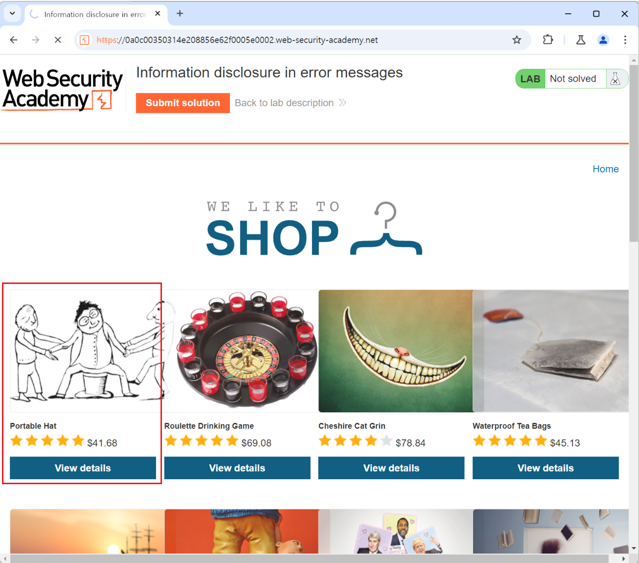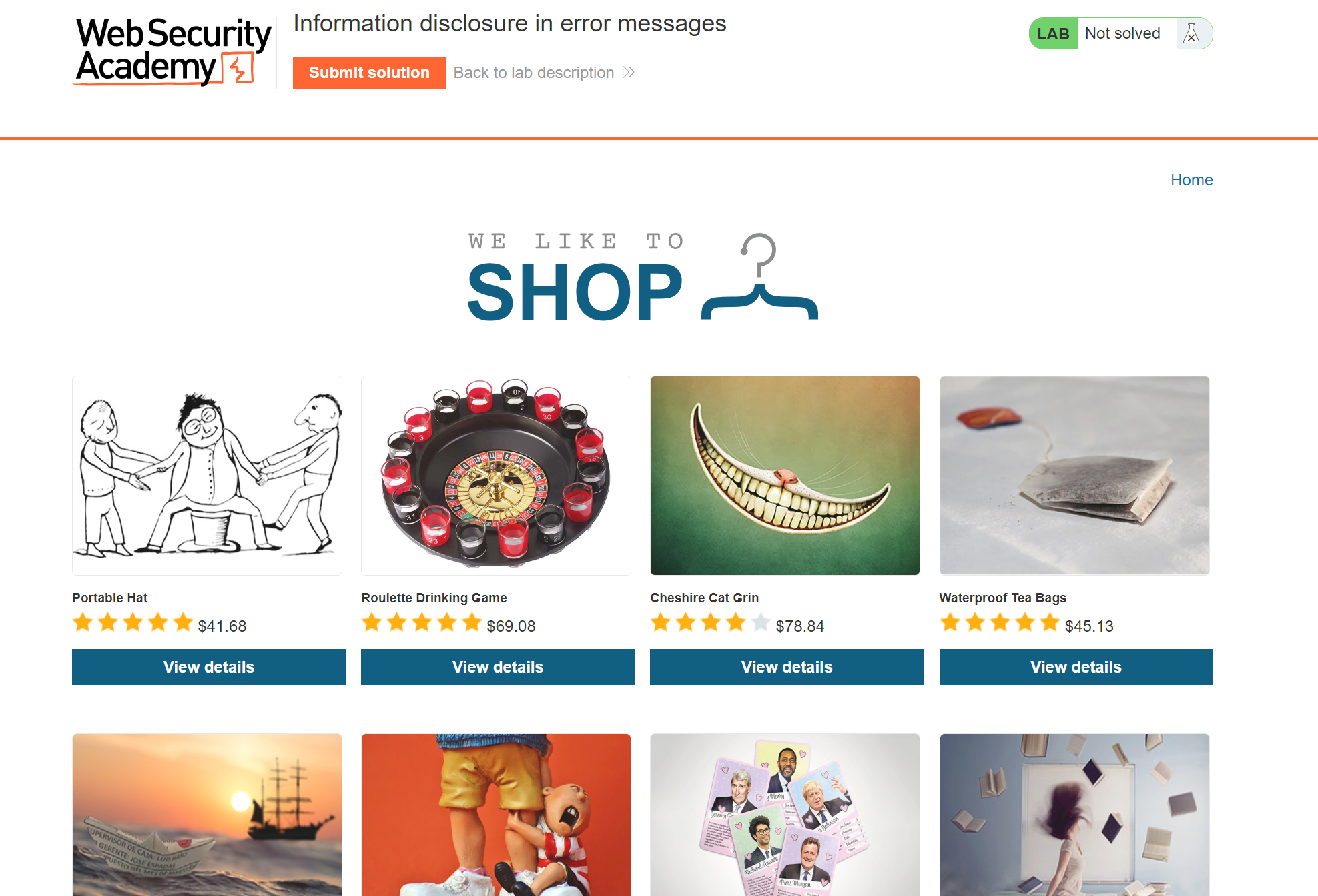 해당 실습은 에러발생 시 취약한 버전의 서드파티 프레임워크가 노출되는 것을 확인하는 실습이다. ACCESS THE LAB 버튼을 클릭하여 실습사이트로 이동할수있다.