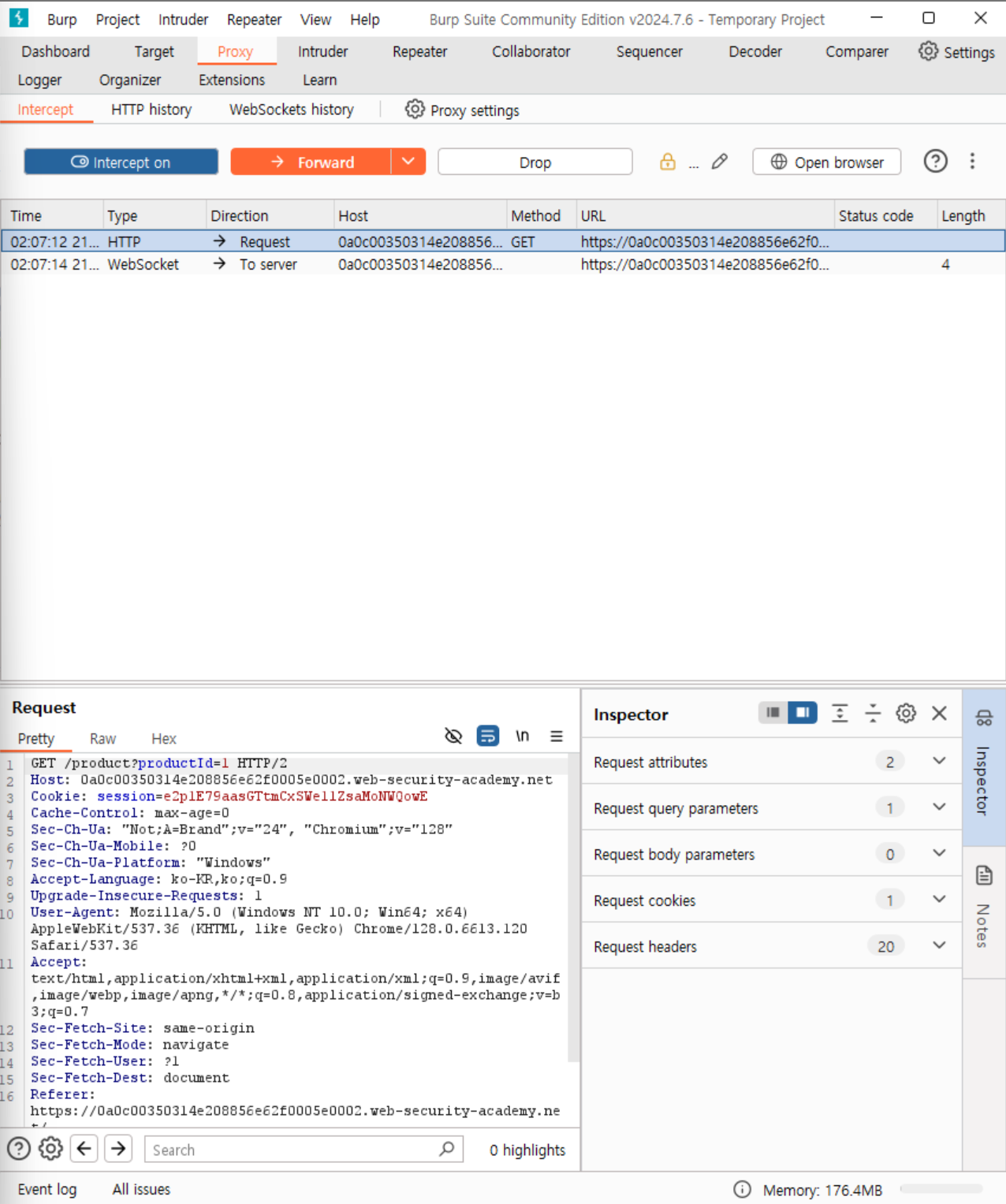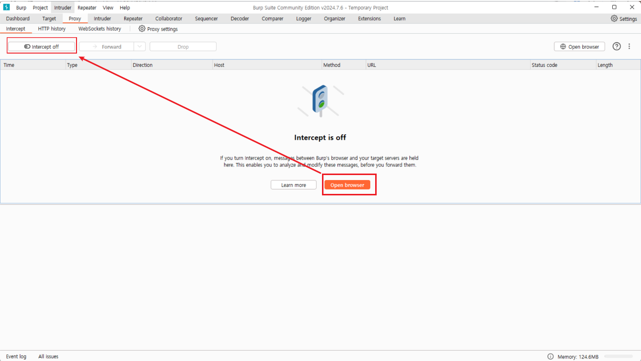 버프스위트의 프록시 기능을 통해 해당 페이지의 요청 및 응답값을 확인할 것이다. Open browser클릭하여 실습사이트에 접속하고 intercept off 기능을 눌러 요청 및 응답값을 프록시가 가로채도록 설정한다.