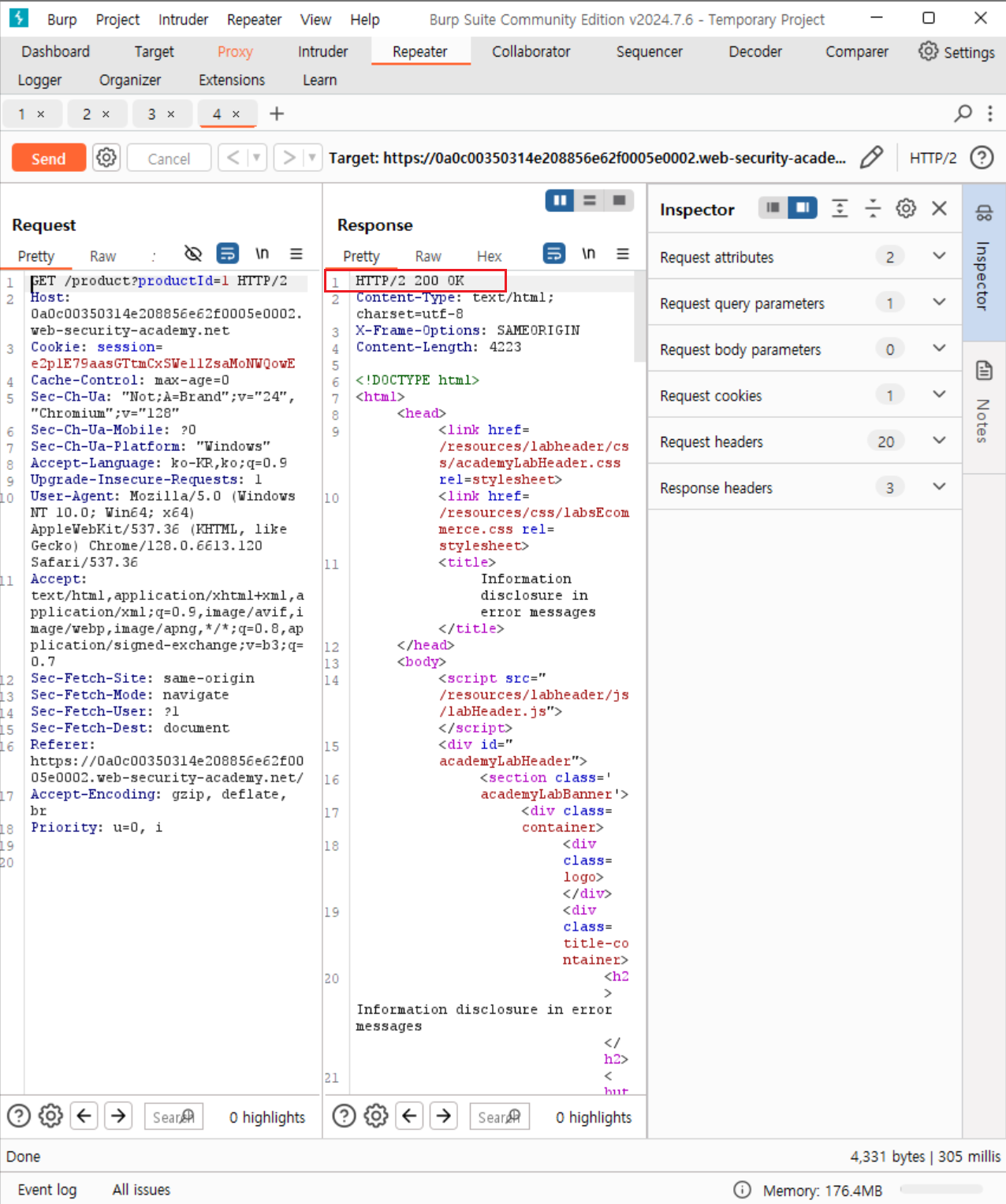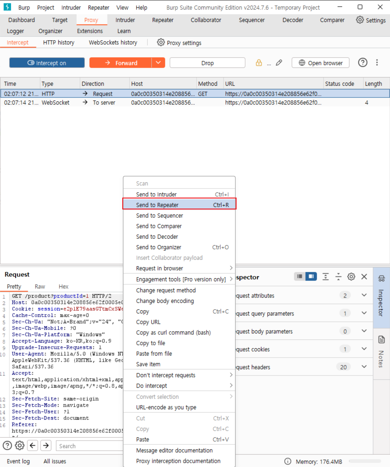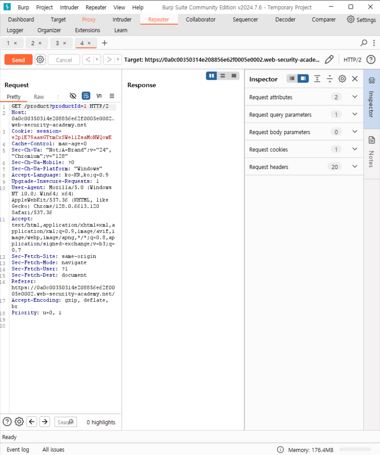 repeater 섹션에서 해당 HTTP 요청 정보를 확인할 수 있으며, Send 버튼을 클릭시 웹서버의 응답정보도 확인할수 있다.
