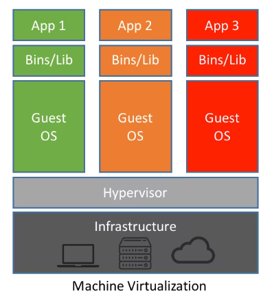 구조를 확인해보면 물리적인 컴퓨터 위에 하이퍼바이저를 올리고 이를 통해 여러대의 가상머신(VM)이 존재하는것을 알수 있다. 각각의 가상머신(VM)은 Guest OS, Bins/Lib, APP을 가지고 있어 독립적인 환경처럼 동작한다.