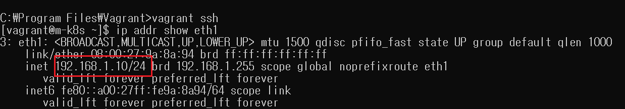 해당 가상머신에 SSH접속을 하고, 설정한 IP주소(192.168.1.10)을 확인합니다.