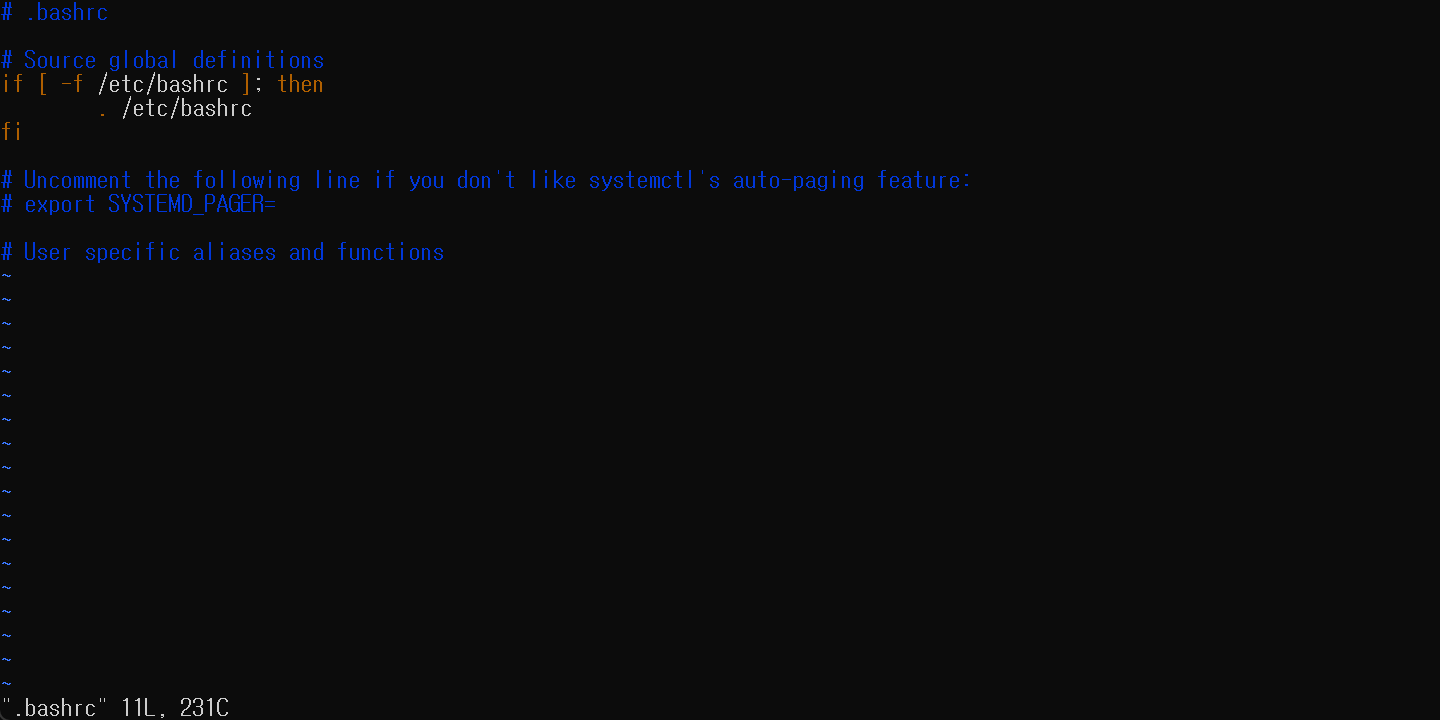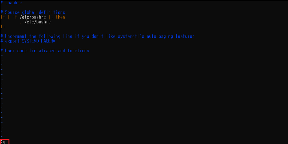 ESC를 누르고 :q를 입력후 vi에디터를 종료합니다.