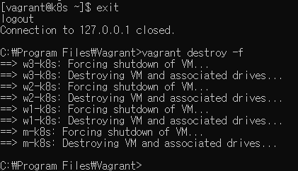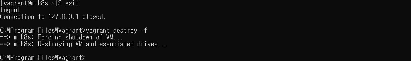 SSH 접속을 종료하고, 가상머신(CentOS)을 삭제합니다. (-f는 가상머신을 강제종료하는 명령어)