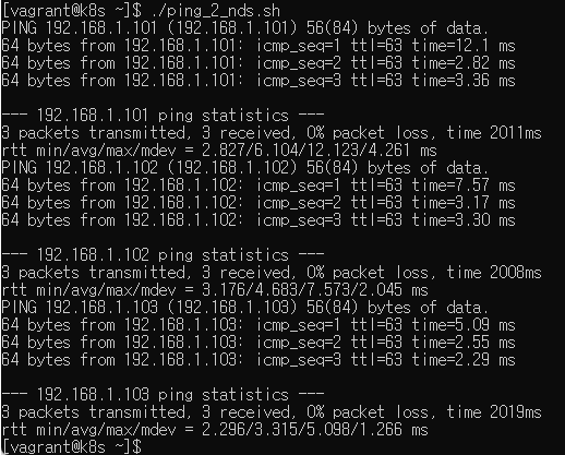 각 노드(192.168.1.101, 192.168.1.102, 192.168.1.103)에 대해 3번씩 ping 명령어를 사용하여 네트워크 연결 상태를 확인합니다.