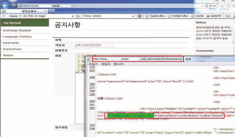 공개용 웹 게시판을 사용할 경우 인터넷에 공개된 각종 취약점 정보로 인해 홈페이지 변조 및 해킹 경유지로 사용될 수 있는 취약점