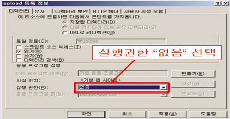 실행권한 없음 설정을 통해 파일이 업로드 되더라도, 해당 파일이 시스템에서 실행되지 않도록 하기 위함