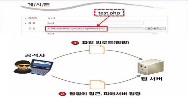서버 측에서 실행될 수 있는 스크립트 파일(asp, jsp, php파일 등)이 업로드 가능하고 해당 파일이 실행이 가능한 경우 시스템 내부명령어를 실행하거나 외부와 연결하여 시스템을 제어할 수 있는 취약점