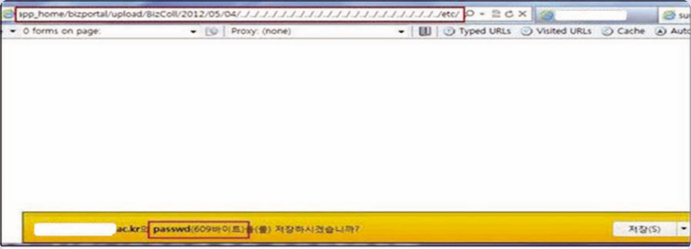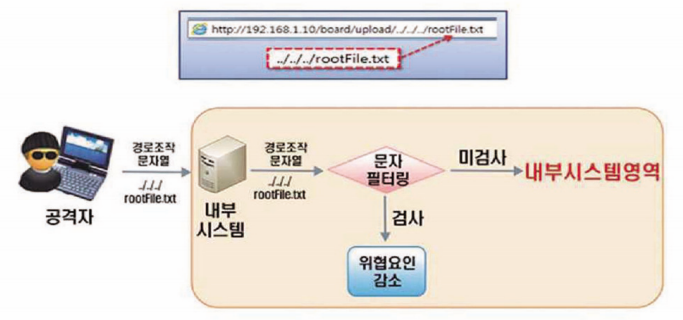 URL에 경로조작(Path Traversal)관련 문자를 입력하여 일반사용자가 접근할 수 없는 영역에 접근한 후, 민감한 파일을 다운로드할 수 있는 취약점