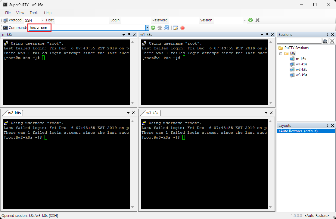 Commands에 hostname을 입력하여, 모든 가상머신에 한 번에 명령을 실행시킬 수 있습니다.(해당 명령어는 호스트의 이름을 확인하는 명령어)