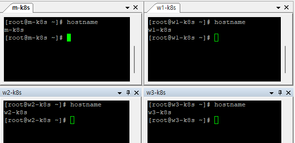 4개의 가상머신에 접속한 것을 확인할 수 있습니다. 빨간 박스에 있는 탭 부분을 드래그 앤 드롭하여 4개의 창으로 만들 수 있습니다.
