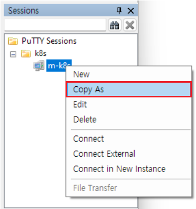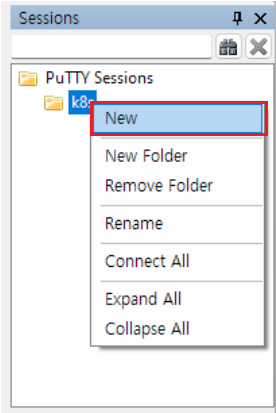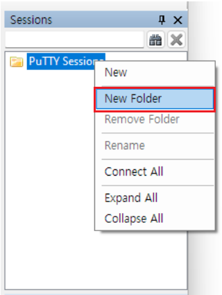 SuperPuTTY의 오른쪽 화면에 위치한 Session 창에 PuTTY Session을 확인할수 있습니다. 해당 디렉터리에 오른쪽클릭을 하여 New Folder를 클릭합니다.