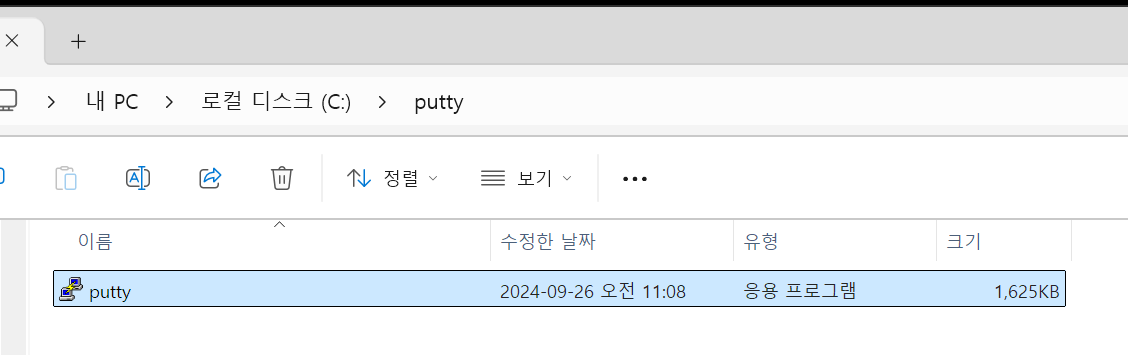 C:\putty 디렉토리를 생성한 후, 해당 디렉터리에 다운로드한 putty 실행파일을 저장합니다.