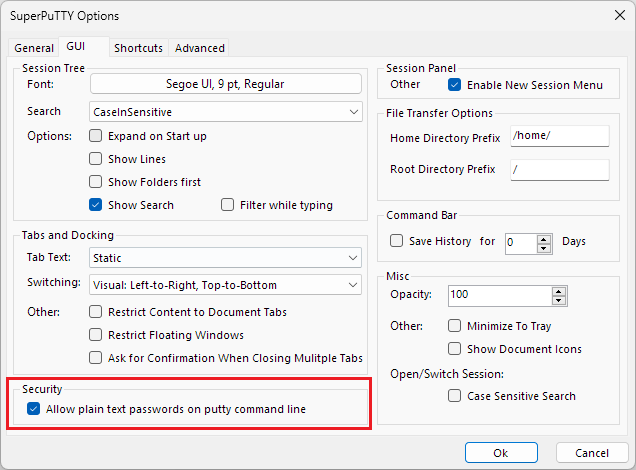 평문으로 접속하기 위해서는 SuperPuTTY의 보안설정을 변경해야 합니다. F2키 또는 Tool > Options를 통해 Security부분을 체크표시합니다.