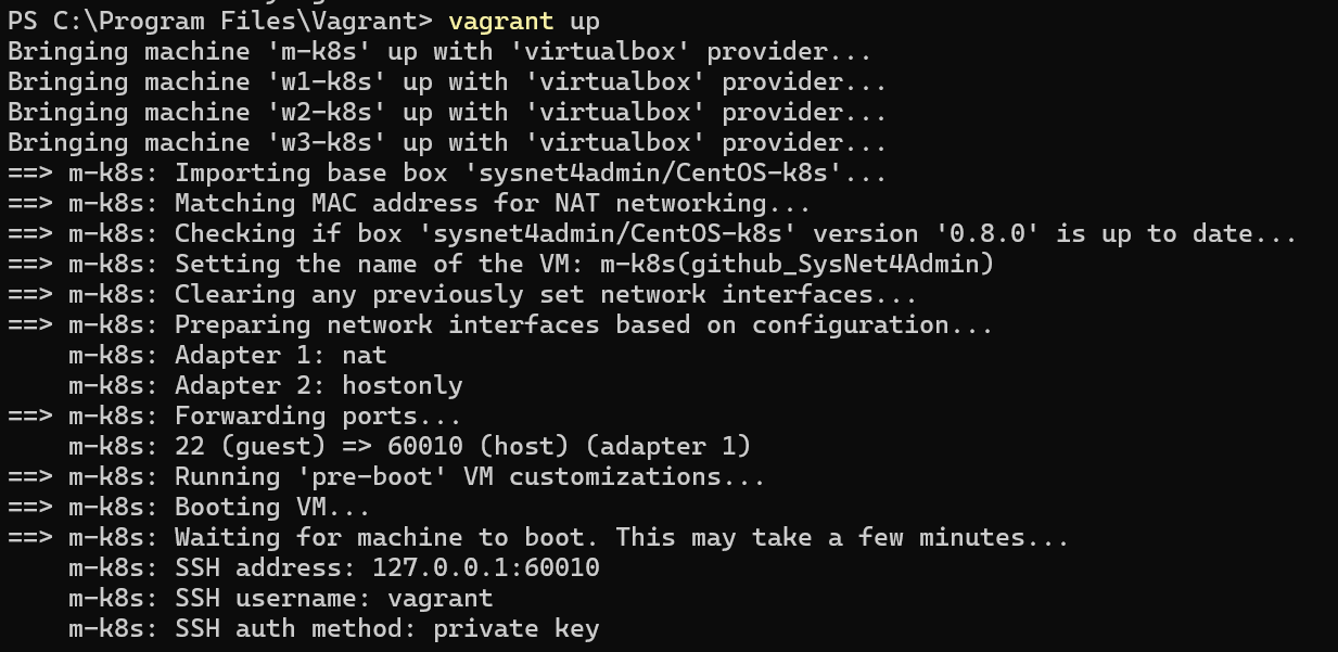 관리자 권한으로 명령 프롬프트를 실행 후, C:\Program Files\Vagrant에 이동하여 여러 대의 가상머신을 생성합니다.(여러 대의 가상머신을 생성해야 하므로, 시간이 오래 걸릴 수 있음)