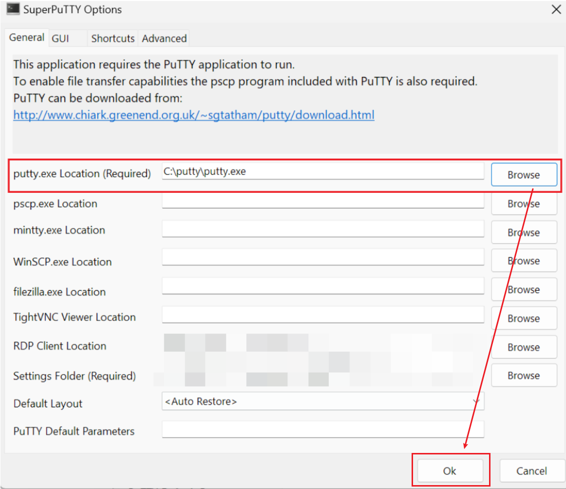 SuperPuTTy는 PuTTY를 통해 실행되므로, 초기 실행 시 PuTTY의 위치를 지정해야 합니다. Browse 버튼을 클릭 후, PuTTY 설치 시 지정했던 C:\putty\putty.exe를 선택하고, OK 버튼을 클릭합니다.(경로는 다를수있음)