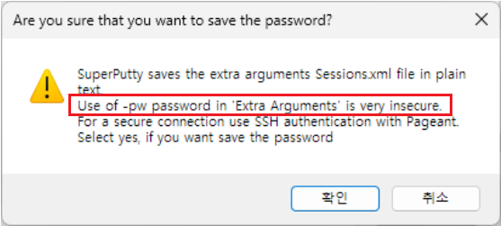 Extra Argument 입력된 값이 평문으로 저장되기 때문에, 보안경고창이 뜬다. 테스트 환경이므로, 편의를 위해 확인버튼을 눌러 그대로 진행합니다.
