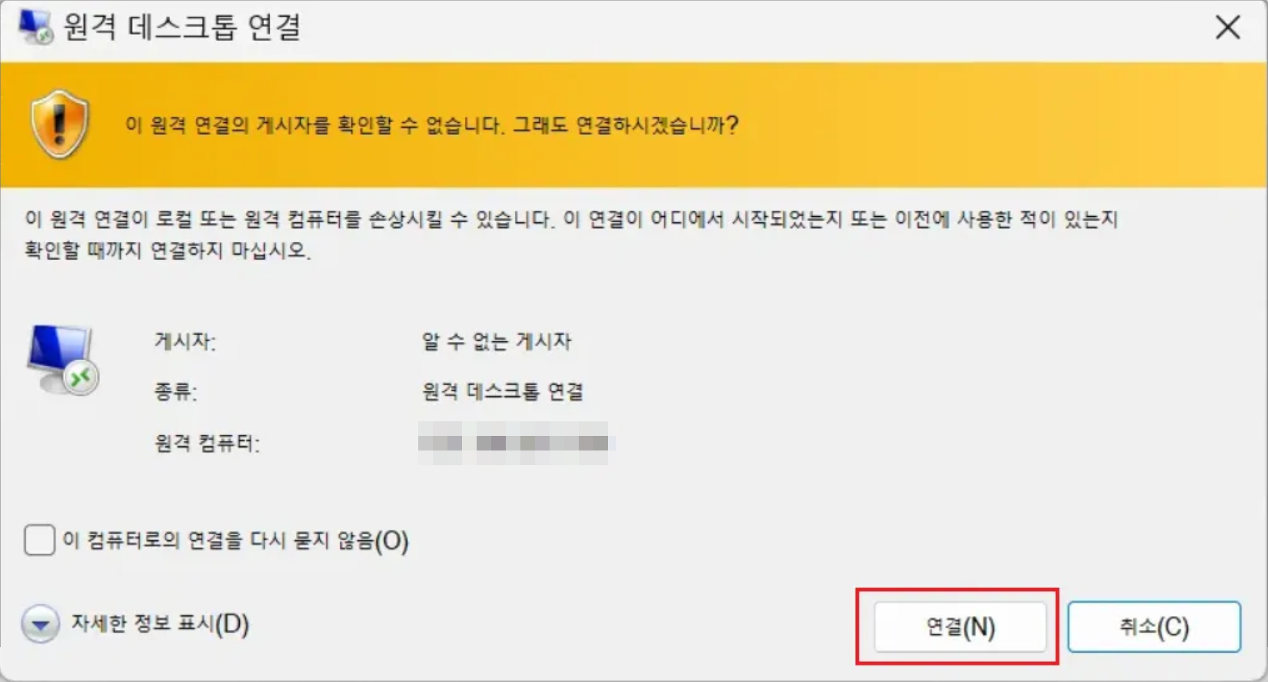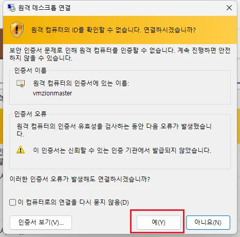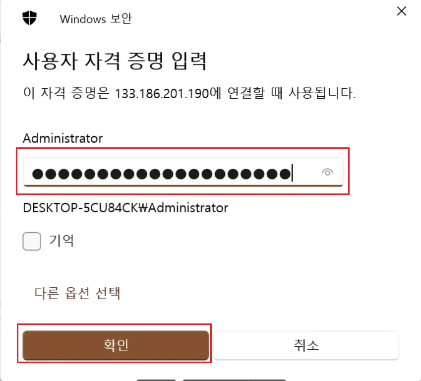4. 연결 - RDP 접속 - 연결(N) - 복사한 비밀번호 붙여 넣기 - 예(Y)