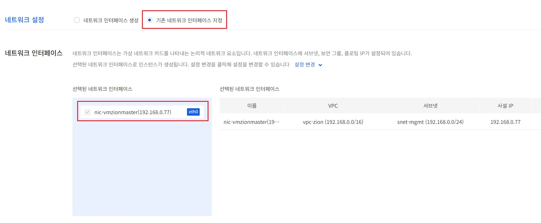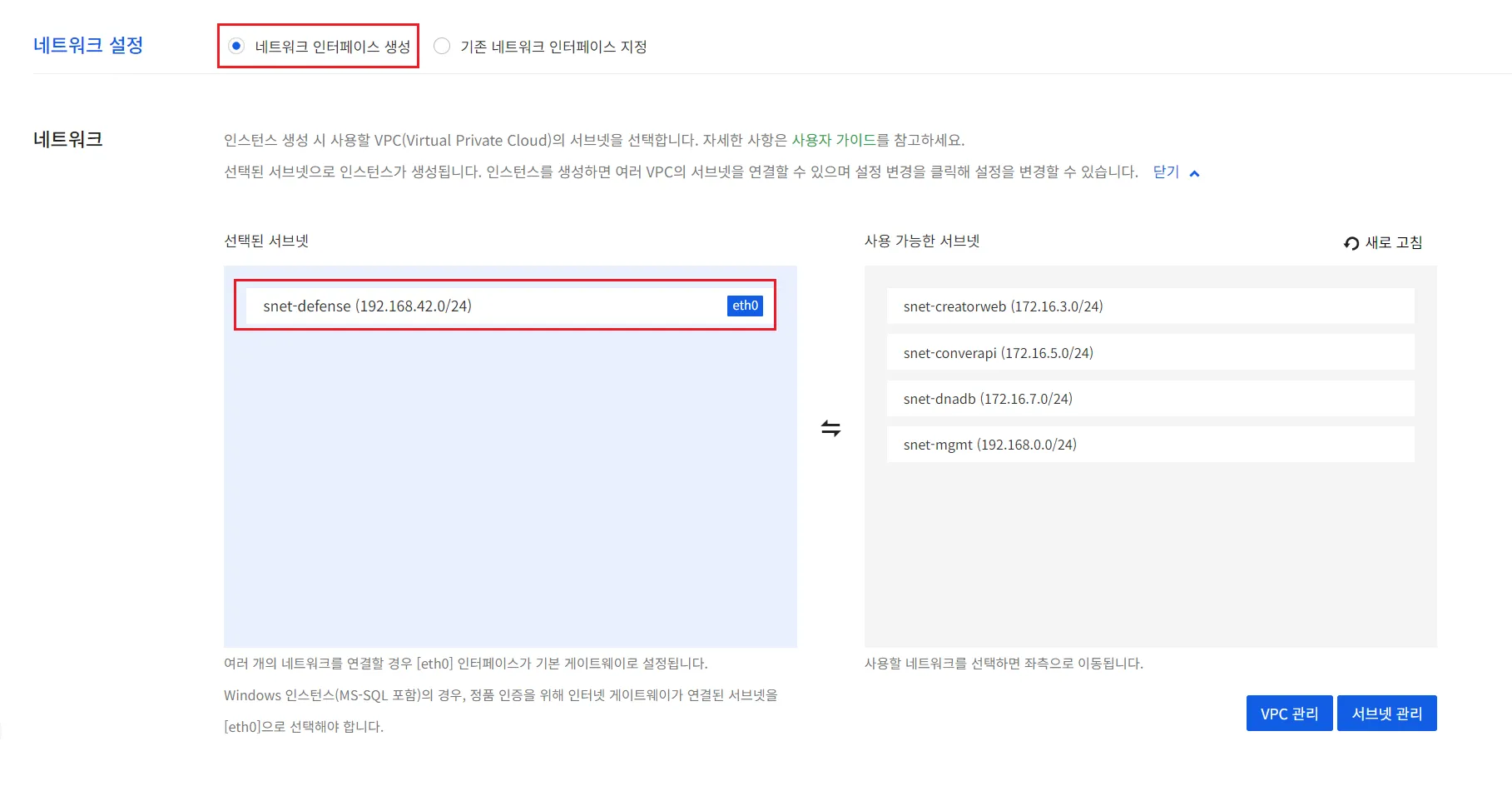 4. 네트워크 인터페이스 생성 - 설정 변경 - snet-defense 선택