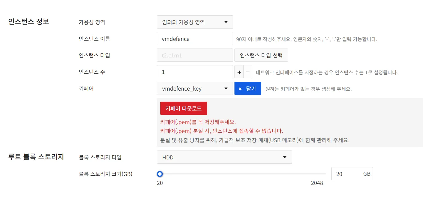 3. 인스턴스 정보, 루트 블록 스토리지(키페이는 vmdefence로 생성)
