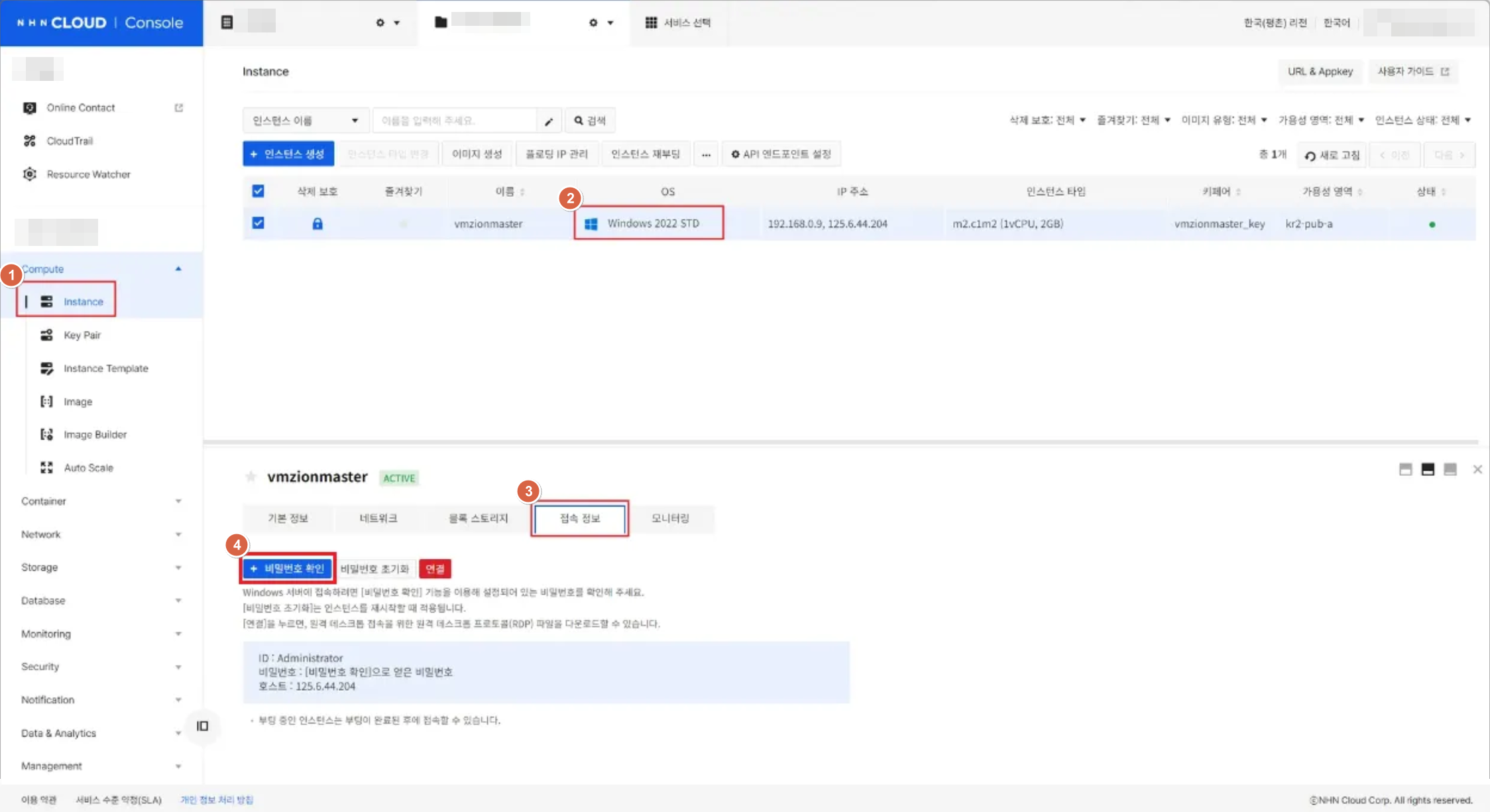 2. Compute - Instance - Windows 인스턴스 - 접속 정보 - 비밀번호 확인