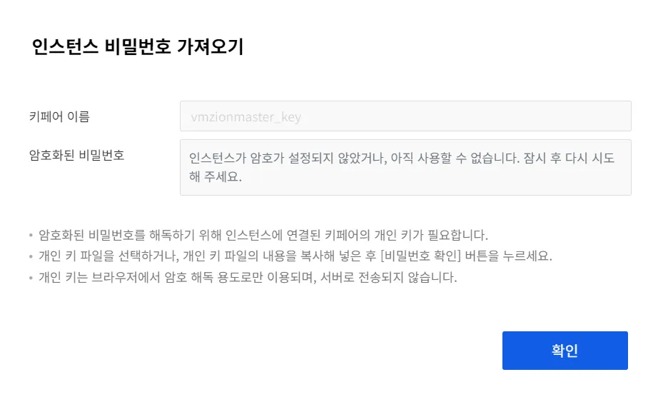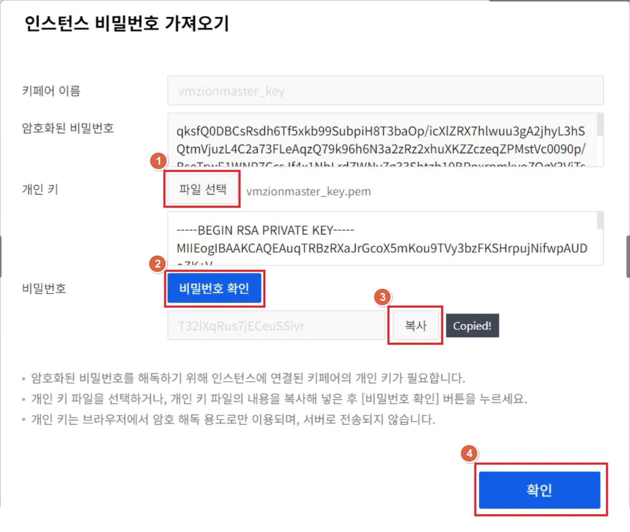 3. 파일선택 - vmzionmaster_key.pem 업로드 - 비밀번호 확인 - 복사 - 확인