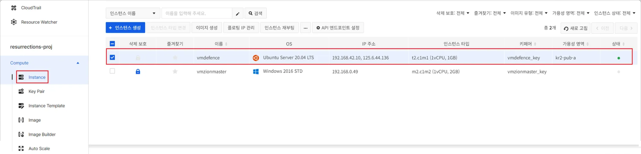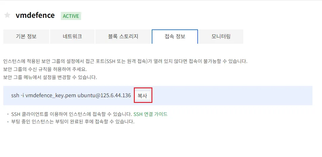 6. Compute-Instance - vmdefence 선택 - 접속 정보 - 복사