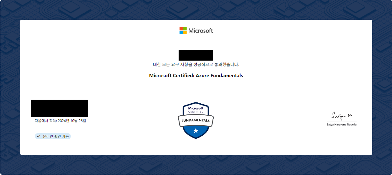 24년 10월에 Microsoft Azure Fundamentals(AZ-900) 자격증을 취득하였습니다.
