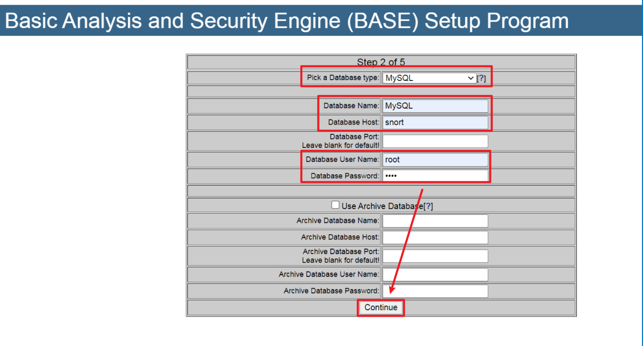 아래와 같이 입력하고 continue를 누른다.(Database Password는 MySQL에서 설정했던 패스워드를 입력한다.)