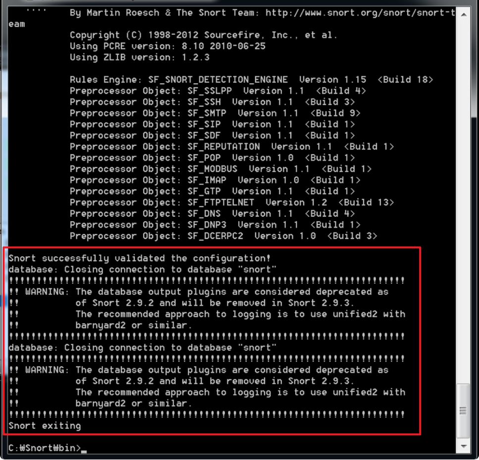 snort.exe -T -c c:\snort\etc\snort.conf -l c:\snort\log -i 1