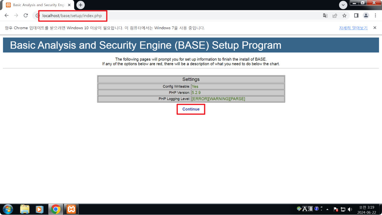 http://localhost/base에 접속하여 continue 버튼을 누른다.